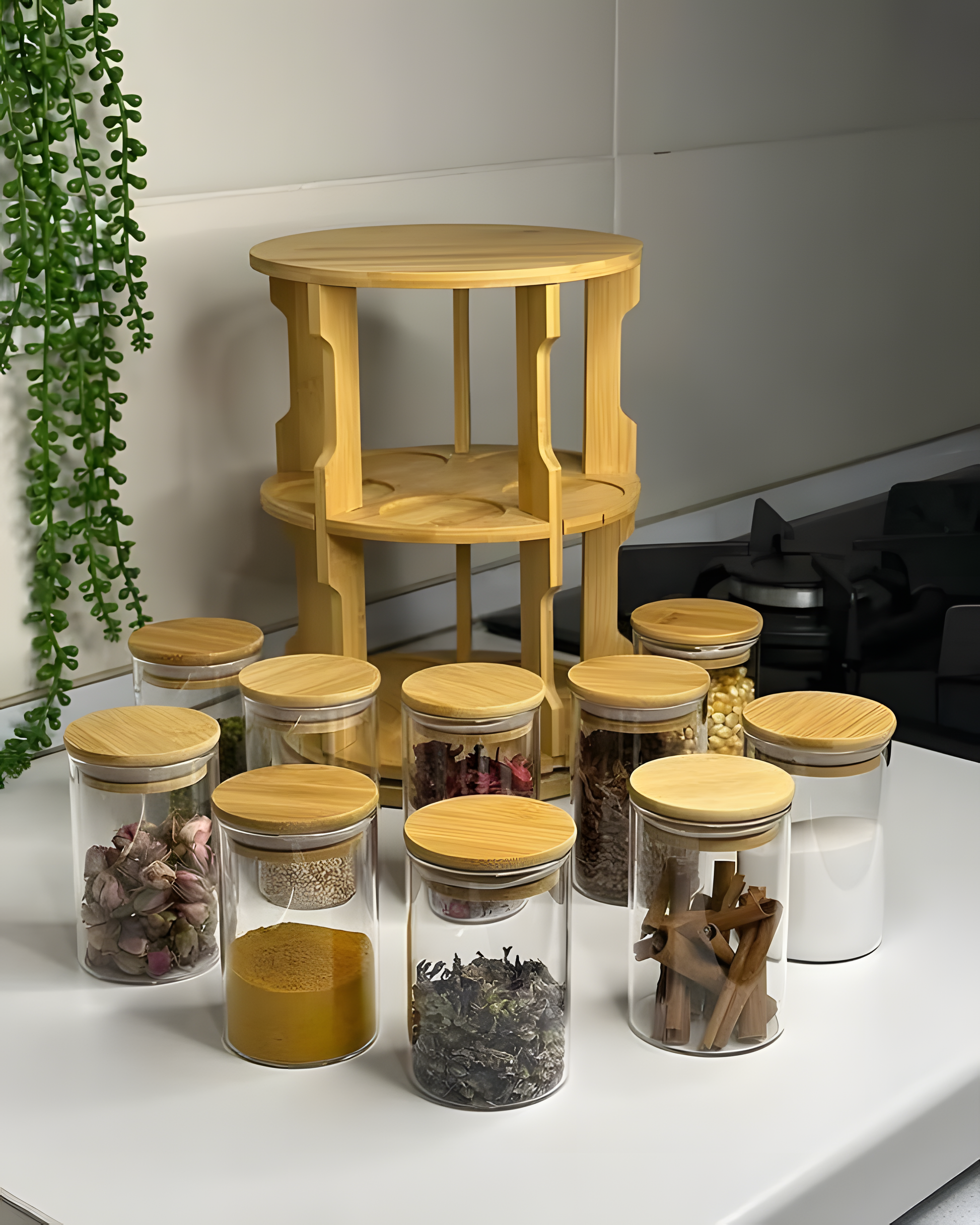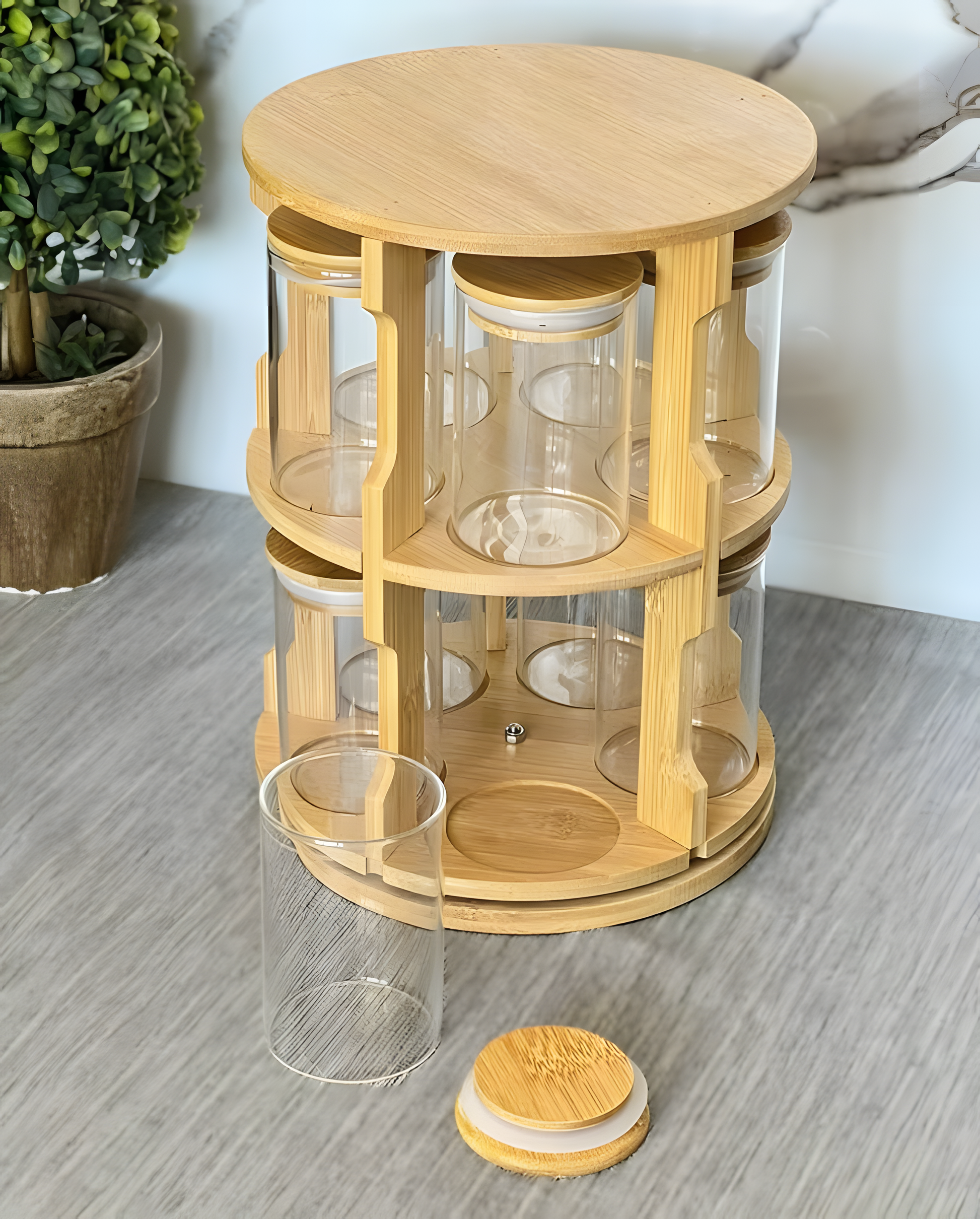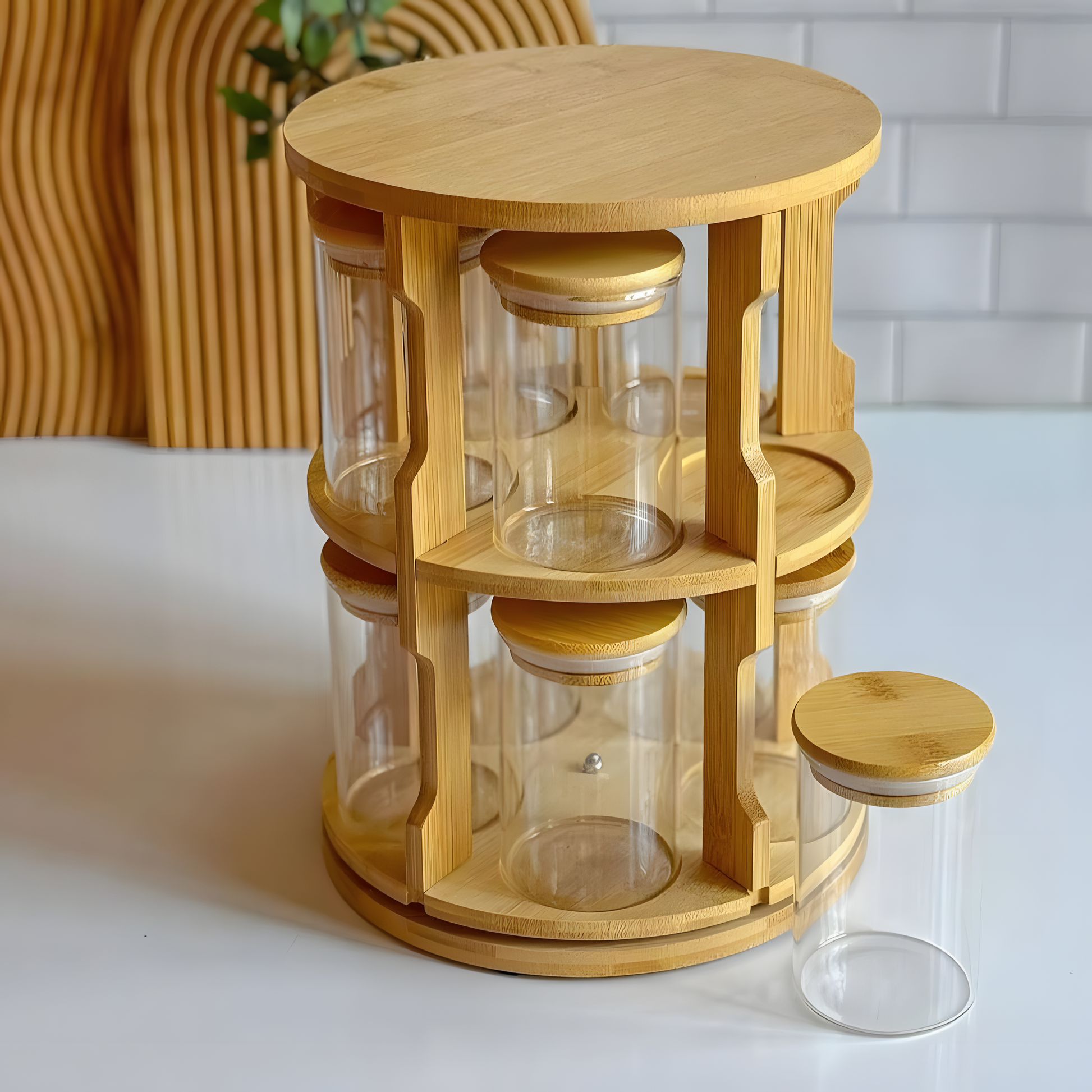 منظم توابل دوار فاخر من الخشب الطبيعي (10 عبوات) الوصف: أضيفي لمسة من الفخامة والأناقة إلى مطبخك مع منظم التوابل الدوار المصنوع من أجود أنواع الخشب الطبيعي. يجمع هذا المنظم بين التصميم العصري والعملي، حيث يأتي مع 10 كؤوس زجاجية شفافة بأغطية محكمة للحفاظ على نكهة التوابل والأعشاب طازجة دائمًا، مع توفير مساحة وتنظيم مثالي.